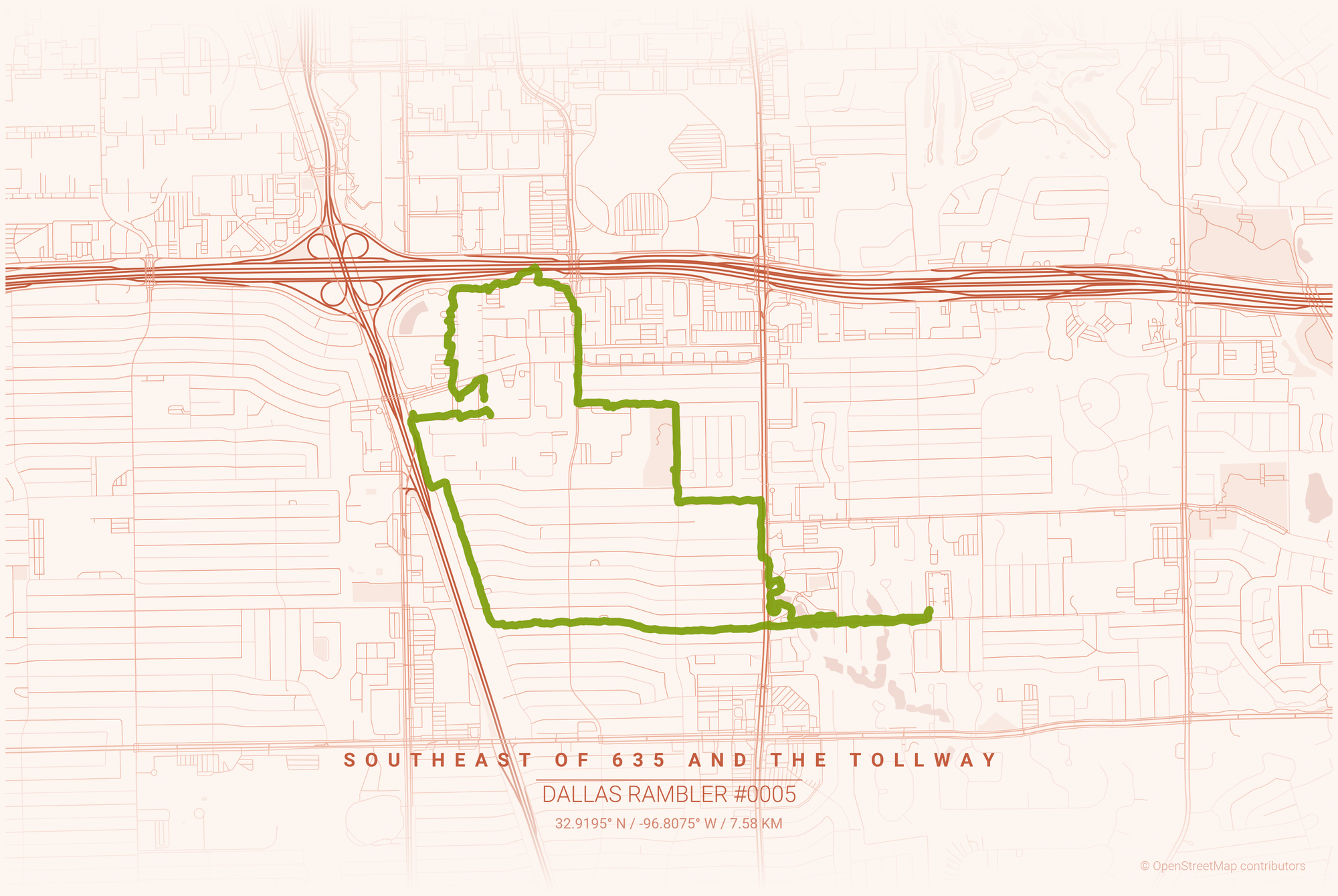 As for the tonight’s route – 9,638 steps with a 20lb plate loaded in my rucksack. I listened to a lot of Talk Talk, specifically The Colour of Spring, wearing Luna Monos as I walked along the outer rim of the neighborhoods southeast of 635 and Dallas North Tollway.